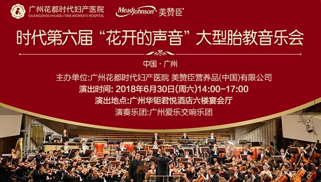 6月30日(周六)下午2:00,时代妇产医院携手美赞臣营养品(中国)有限公司联合主办的第六届时代 “花开的声音”大型胎教音乐会,在广州华钜君悦酒店浓情开幕!特邀广州爱乐交响乐团,众多音乐家现场演奏有益于胎教的经典曲目,让准爸妈和胎儿现场享受音乐盛宴。